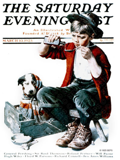 If there’s anything worse than being sick, it is anxiously taking care of a loved one who is ill. Rockwell’s March 1923 cover shows us a boy tending to his under-the-weather puppy. That’s what best friends are for.