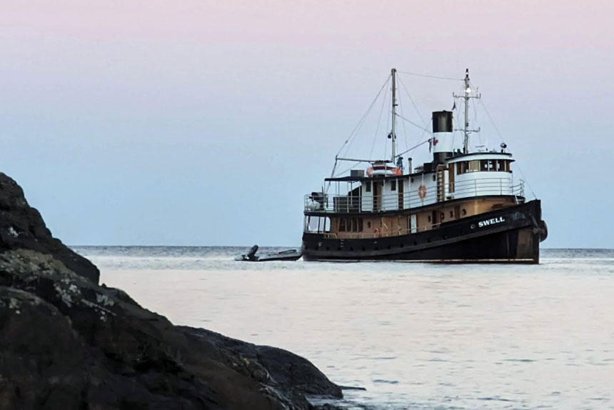 After dropping anchor in a secluded cove, the crew served a delicious dinner inside the comfortable wood-paneled salon of the Swell. Originally a coal-fired steam tug designed by renowned boat builder Arthur Moscrop, Swell was launched in Vancouver, British Columbia, in 1912. Although the historic workboat might not possess the sleek beauty of a sailing yacht, a thoughtful refit had saved her from the scrap heap and transformed her into a comfortable 12-passenger vessel with a rugged West Coast charm and character.
