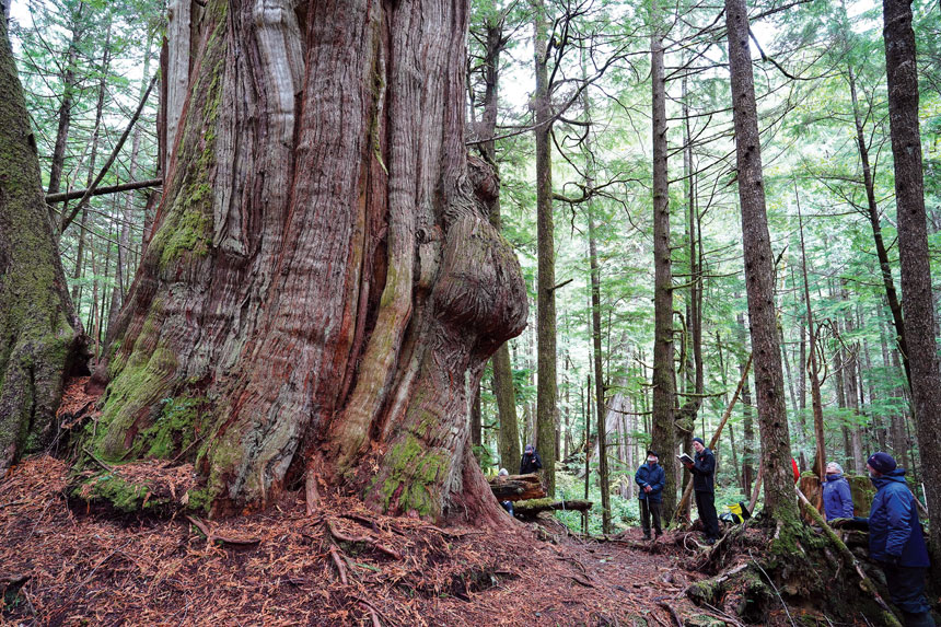 The trail through the old forest was mucky, but as we ventured deeper, the crew pointed out trees whose heavy limbs were draped with Old Man’s Beard, or Usnea longissima, lichen that grows only in the purest air. A soft rain started to drum against the canopy, its rhythm as familiar as the laughter of ravens echoing through the trees. Reaching our destination, the 12 of us encircled a monumental grandfather cedar tree, fingertips barely touching, in a silent homage to the resilience of this land.