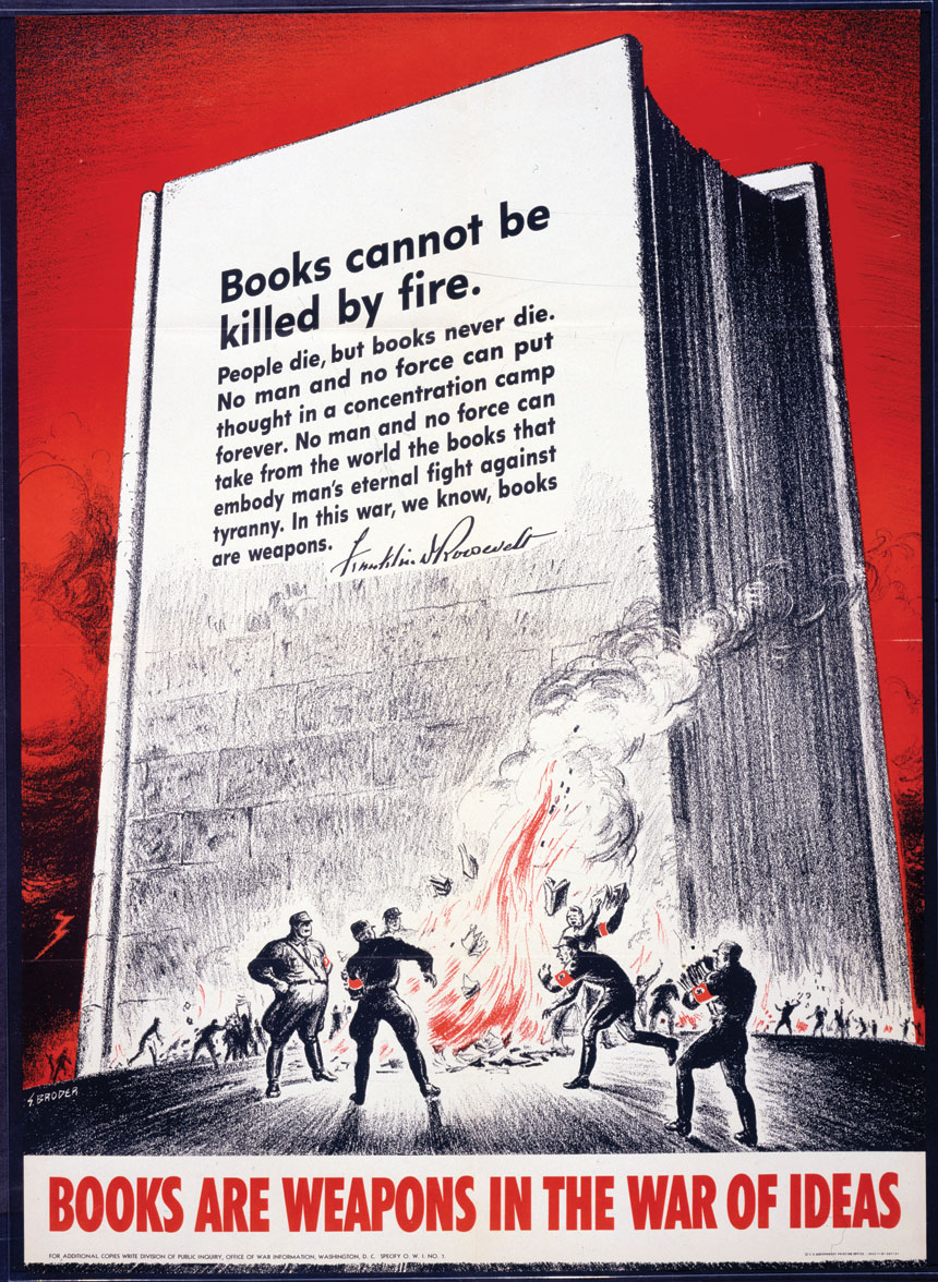 “We all know that books burn — yet we have the greater knowledge that books cannot be killed by fire,” Roosevelt stated. “People die, but books never die. No man and no force can abolish memory. No man and no force can put thought in a concentration camp forever. No man and no force can take from the world the ideas that embody man’s eternal fight against tyranny of every kind. In this war, we know, books are weapons.”