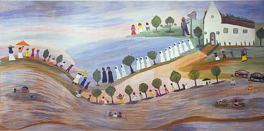 Halfway across the country, Americans were also being drawn to another self-taught, grandmotherly artist: Clementine Hunter. Like Moses, Hunter began painting later in life, translating memory and experience into vivid images of her world. In 1939, Hunter began painting scenes from the cotton fields around Louisiana’s Cane River. She depicted images of life at Hidden Hill Plantation, where she had been born in the 1880s, and Melrose Plantation, where she lived and worked as an adult. “I tell my stories by marking pictures. The people who lived around here and made the history of this land are remembered in my paintings.…My paintings tell how we worked, played and prayed,” she once explained. Hunter’s art focused on people and their activities, such as doing laundry, going to church, or picking cotton. Religious scenes from African American life and the Bible were not uncommon.