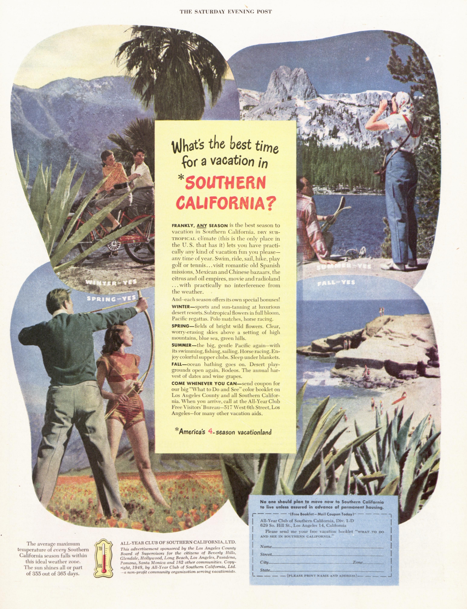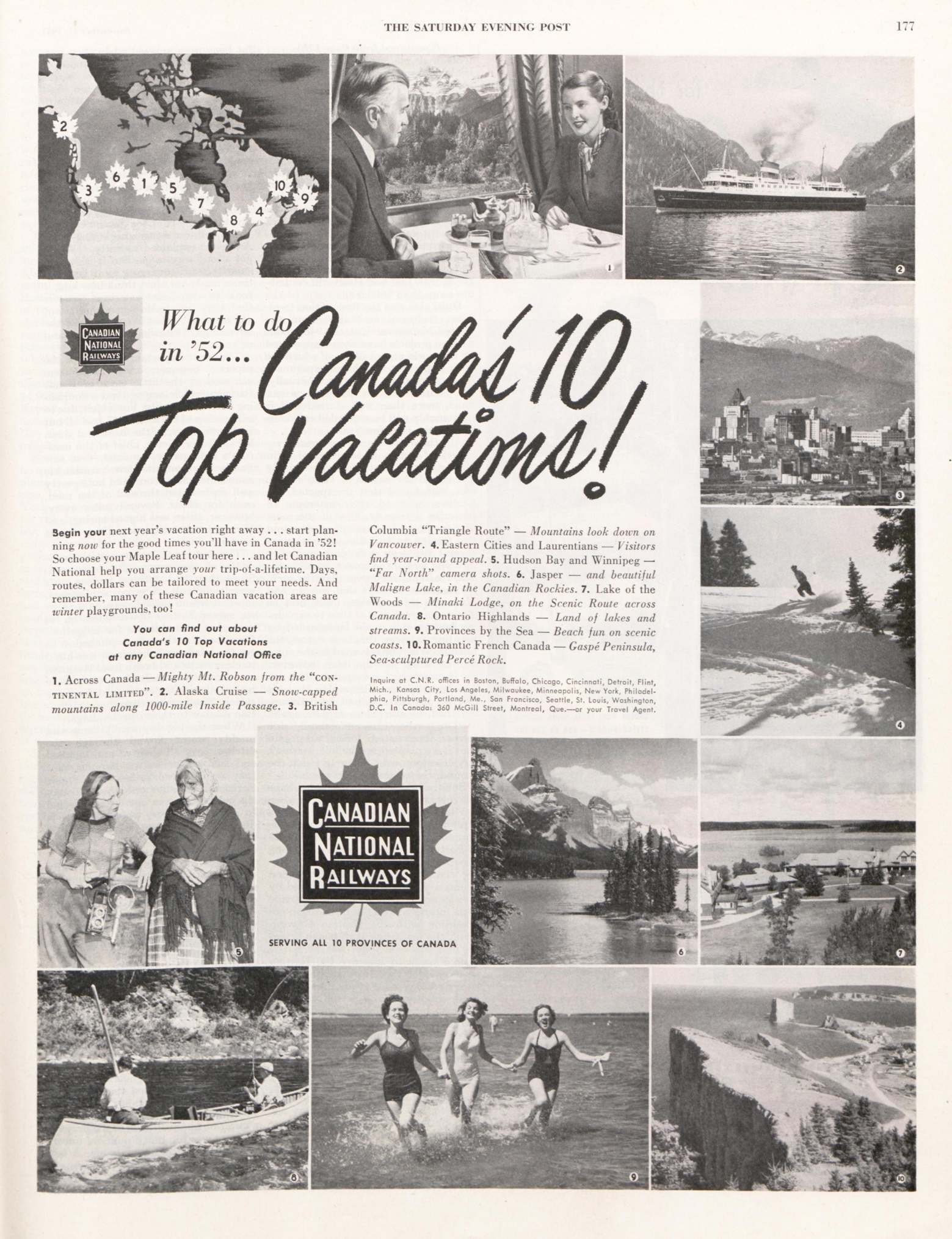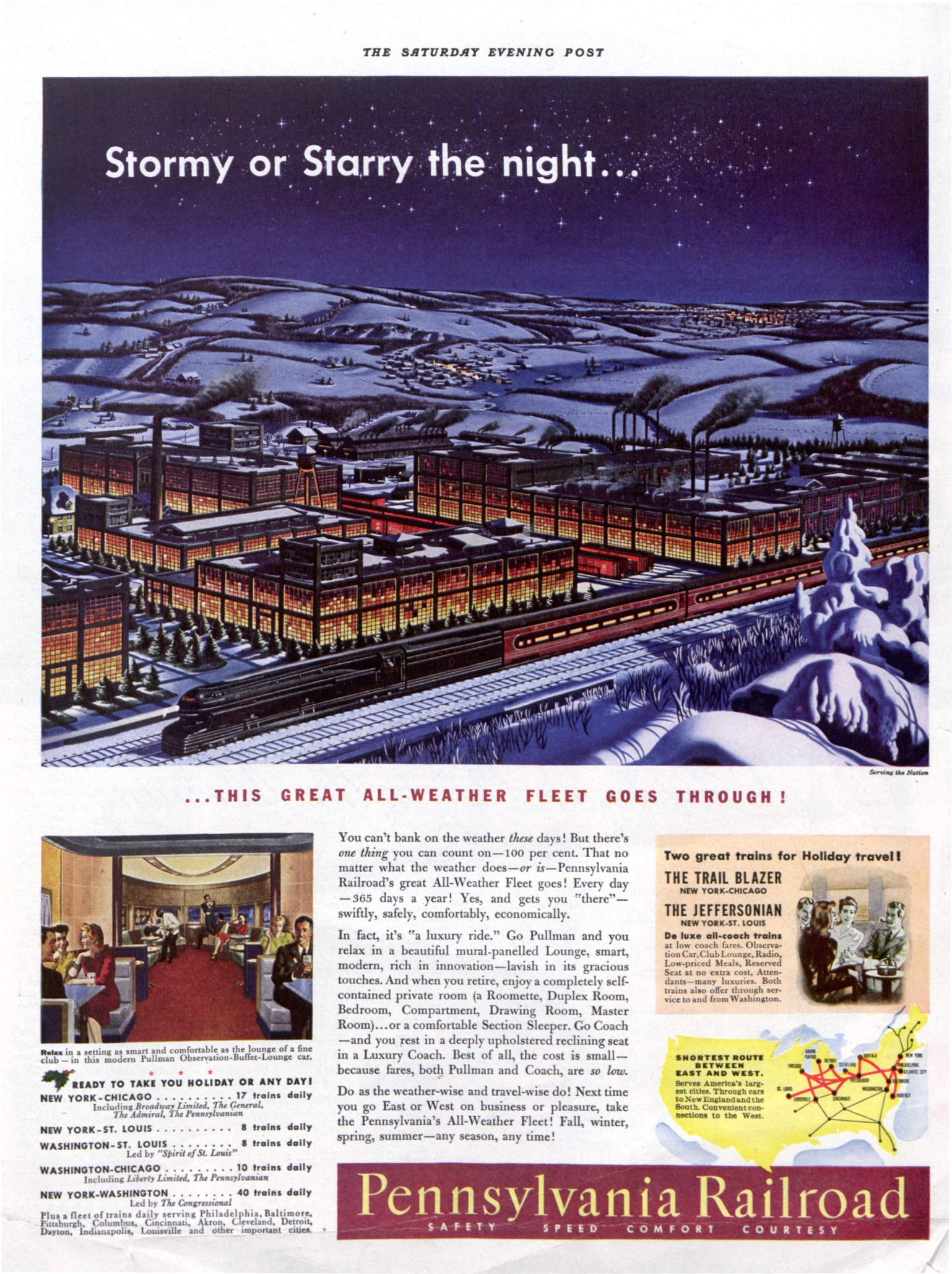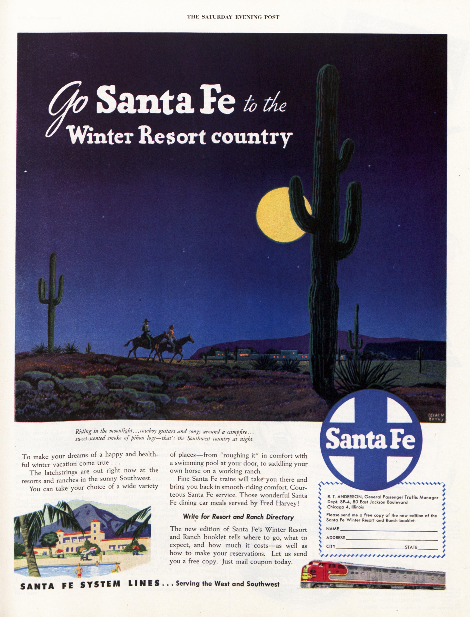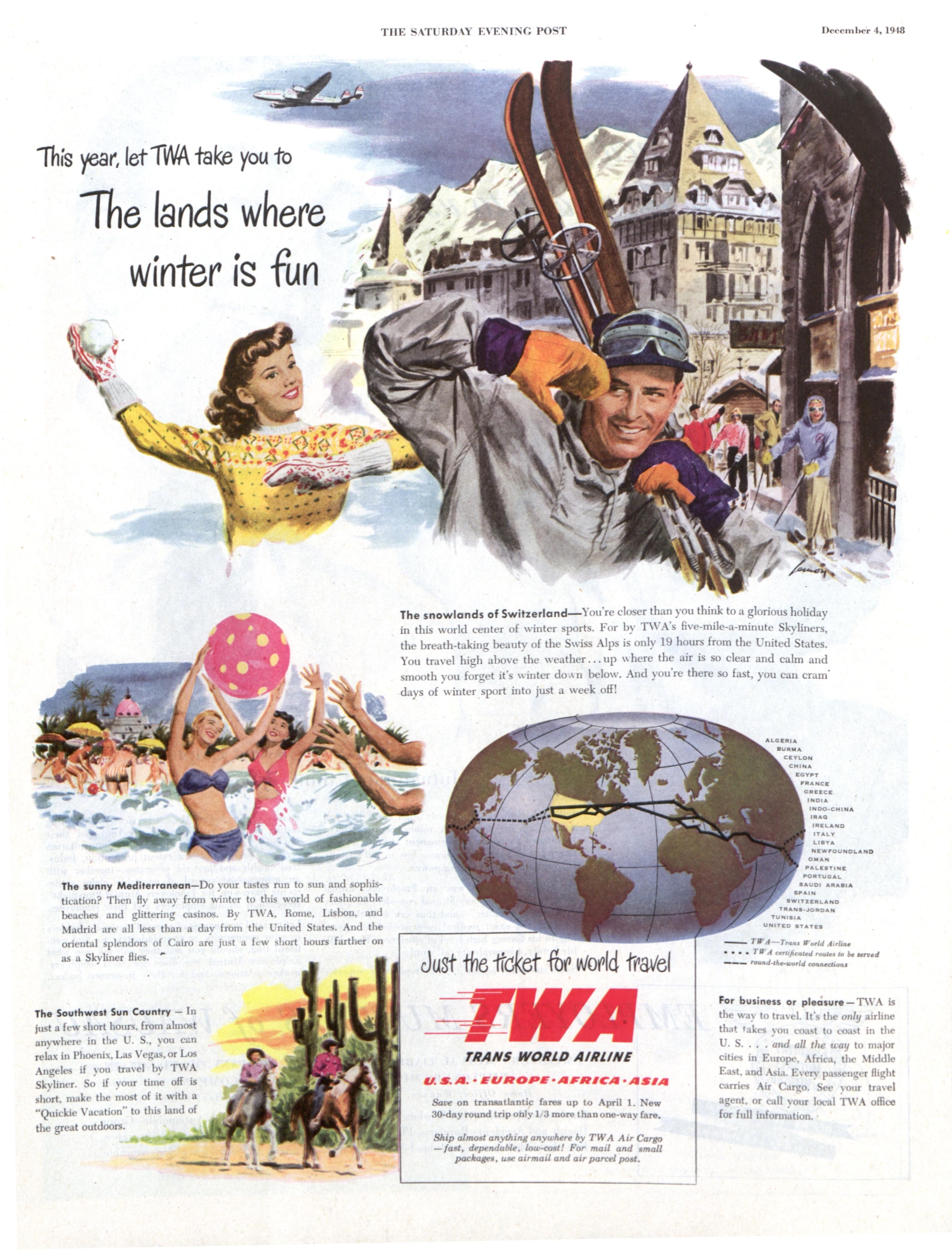 In the middle of the 20th century, The Saturday Evening Post was filled with ads for travel, whether by bus, train, or car. The winter months in particular offered ads depicting full-color fantasies of escaping to a livlier scene.