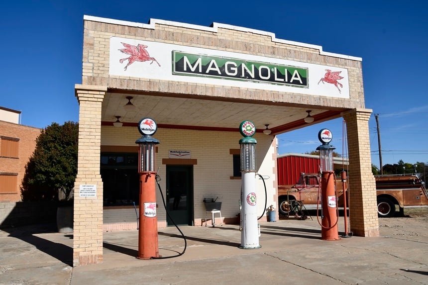 A Route 66 road trip continues past Bushland and Wildorado to Vega, where the Magnolia Gas Station predates the Mother Road. Donny Allred, a retired Oldham County judge who now volunteers at the small museum inside the gas station, says that people from all over the world sign the guestbook.