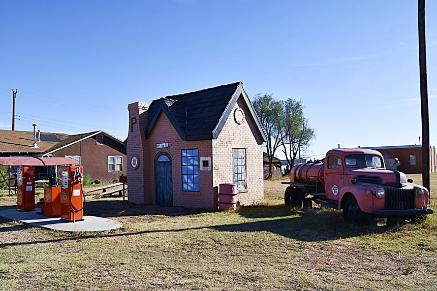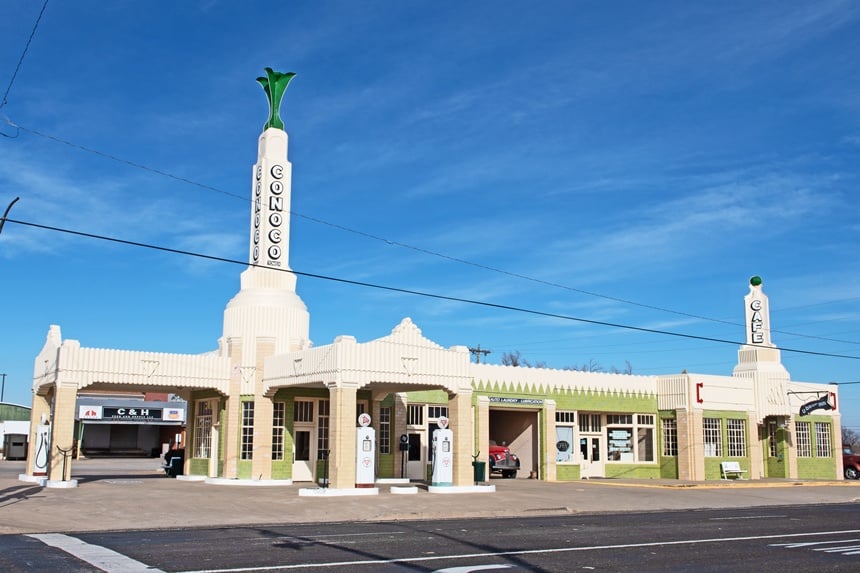 McLean also boasts the first Phillips 66 gas station on Route 66. (According to the National Museum of American History, Phillips Petroleum Company executives chose the Phillips 66 name because the car testing its fuel reached 66 miles per hour on Route 66.) Like the two gas stations in Shamrock, you can only walk around the 1928 station’s exterior, but for Route 66 enthusiasts, it’s worth the stop to see its cottage style architecture, complete with a beige brick chimney and black shingled roof.