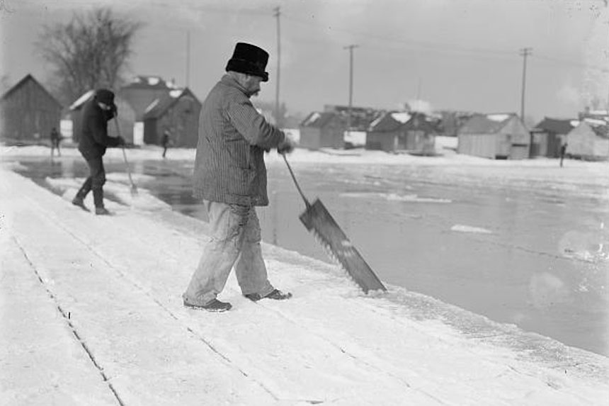 We went back to work, each of us sawing along grooves from the open water back toward the solid ice. After we’d cut four or six parallel lines, we’d stop sawing. One of us would grab the breaking bar, a wedge-shaped piece of steel on a long wooden handle, drive it deep into the one groove still holding the block with a twisting motion, and then pry until the block snapped at the groove. Then the other man would take a pike pole and float the block into the channel where the pushers could take over and move it to the conveyor system closer to shore.