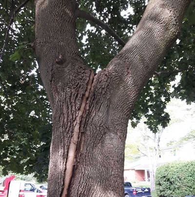 But limbs are not the only places a tree can break. If a tree has more than one main trunk, called codominant trunks, they can fail at the trunk-to-trunk union. This is catastrophic for the tree, rendering it hazardous. Needless to say, such failures often result in property damage. Codominant trunks are often weakly attached to one another, as they typically meet at tight angles with only bark (called bark inclusion), and no wood, between them. The good news is that most weak unions can be strengthened with the right kind of supports.