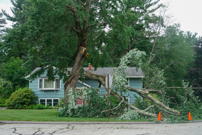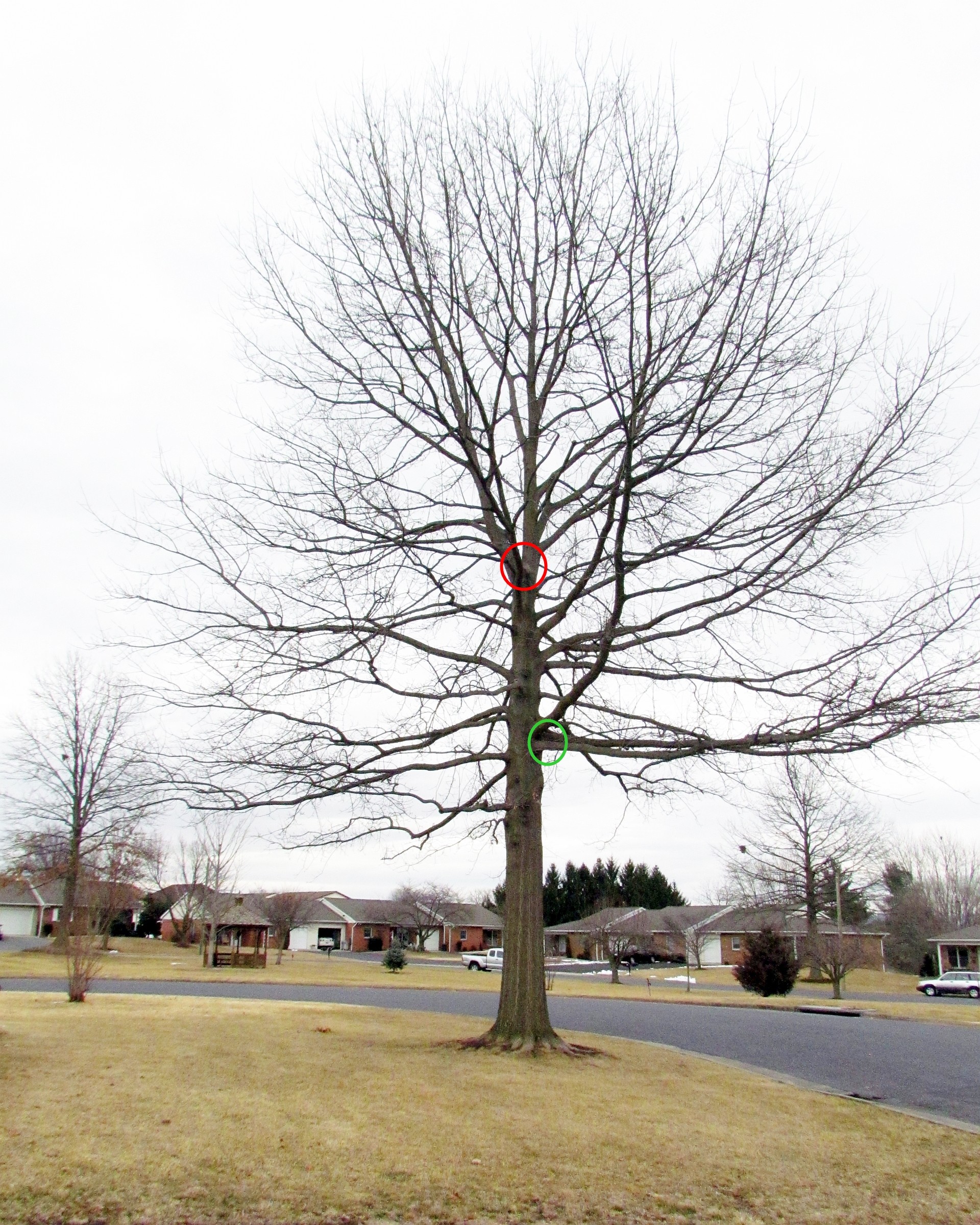 A key factor in predicting limb breakage is the angle where branches meet the trunk. Although it may seem counterintuitive, the more upright a branch is in relation to the tree, the more likely it will split off during a storm, because there is nothing but bark between the branch and trunk on the “uphill” side of the juncture. But branches that meet the trunk close to 90 degrees (horizontal) have sound wood on all sides of the attachment points, and are far less prone to breakage.