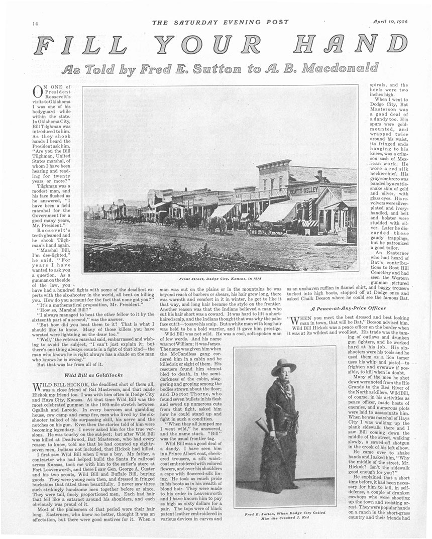 —“Fill Your Hand,” as told by Fred E. Sutton to A.B. Macdonald, in the April 10, 1926, issue of The Saturday Evening Post