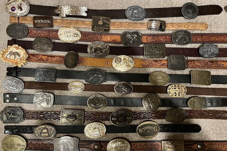 Harrison has been collecting buckles since he was a teenager. His collection is a combination of award belt buckles from local ski events; buckles that represent local businesses and ranches; and buckles that say “Jackson Hole” or Wyoming.” He also collects buckles made in Jackson in the 1970s by Wyoming Studio Arts, particularly those by sculptor James Lind. “My belt buckle collection is entirely buckles of local interest,” he says.