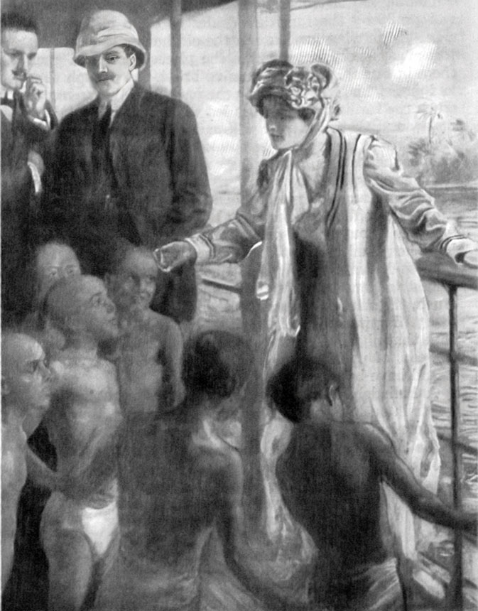 Whether it was that strange willfulness of hers, or whether she doubted the boy could be persuaded, there is no telling. It was unexpected to all of us. Out from the shade of the awning the coin flashed golden in the blaze of sunshine and fell toward the sea in a glittering arch. Before a hand could stay him the boy was over the rail and curving beautifully downward after the coin. Both were in the air at the same time. It was a pretty sight. The sovereign cut the water sharply, and at the very spot, almost at the same instant with scarcely a splash, the boy entered.