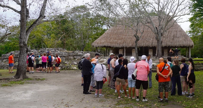 I disembark Royal Caribbean’s 4,500-passenger Freedom of the Seas, a hormone-infused descendant of Song of Norway, one of six megaships that will today disgorge some 24,000 human beings onto Cozumel’s two expansive piers. (Happily, the quaint white stucco customs house that greeted me four decades ago still stands.) The line of passengers waiting for taxis curls around a block of shops in the cruise port’s retail village which, I sadly note, was not only built sometime after my first visit, but is now showing signs of replacement-worthy deterioration. For simplicity’s sake, I have opted to take a bus tour back to San Gervasio, one that combines a visit to the archaeological site with a stop at a Mayan chocolate company. (Judging by the conversations among my fellow travelers, the chocolate is the main attraction.)