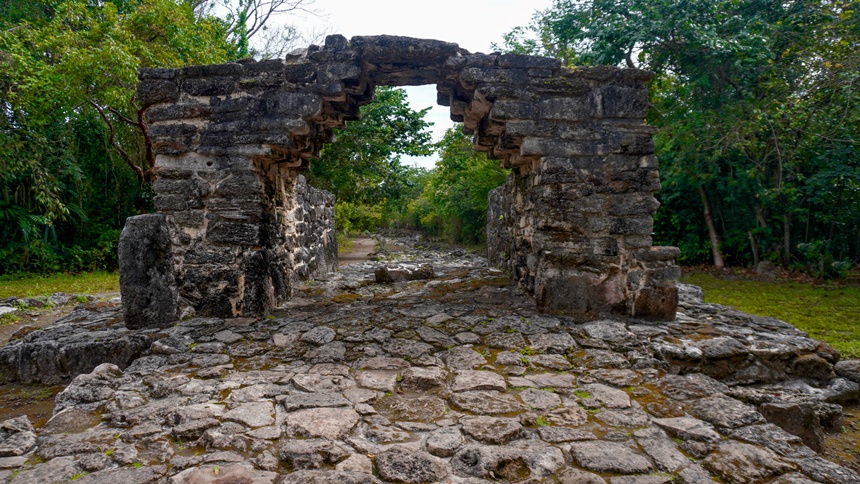 The Mayans were famously short in stature, but even to them, this seven-foot-high arch could not have seemed imposing. Still, it is rich in symbolism: Outlined on the inside of the arch are seven stepped levels leading to a wide, flat top — a direct visual reference to the monumental pyramids of Chichén Itzá.
