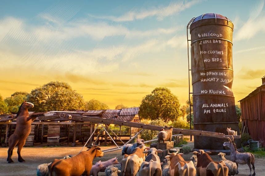 Yet, the essence of Orwell’s cautionary fable endures as Serkis’s 21st-century menagerie negotiates the major touchpoints of the original. The specter of communism may here be replaced largely by slavish pursuit of material wealth, but the end point — surrender of freedom in the name of sustaining it — remains.