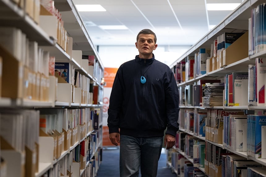 Time passes, and presently we find Davidson as a young adult (Robert Aramayo, Elrond on Amazon’s The Lord of the Rings: The Rings of Power). He’s still living at home with his mom, his father having long since stalked out of their lives. A battery of drugs has somewhat dulled his Tourette symptoms, but they’ve also rendered him unable to drive and mildly brain-fogged. Henderson – best known to movie audiences as “Moaning Mona” in the Harry Potter films – plays John’s mother as a somewhat mousy, relentlessly critical caregiver. On shopping trips in town, she endlessly whispers desperate commands, hissing at John not to do the things he simply cannot help doing. Their mutual frustration – with John’s condition and with each other – is palpable.