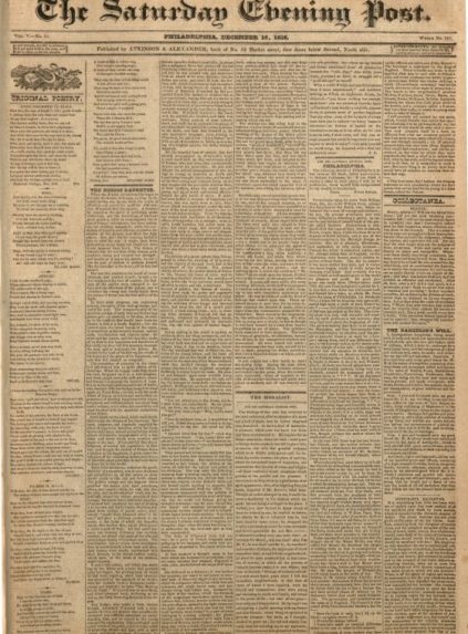 Cover Art Archive December 16, 1826 December 16, 1826 License this image from Curtis Licensing Artist on the Cover: N/A Unlock this content with unlimited access and exclusive membership benefits. Unlock now Related Cover Art More Cover Art Baby Carriage Norman Rockwell May 20, 1916 Circus Strongman Norman Rockwell June 3, 1916 Gramps at the Plate Norman Rockwell August 5, 1916 Redhead Loves Hatti Norman Rockwell September 16, 1916